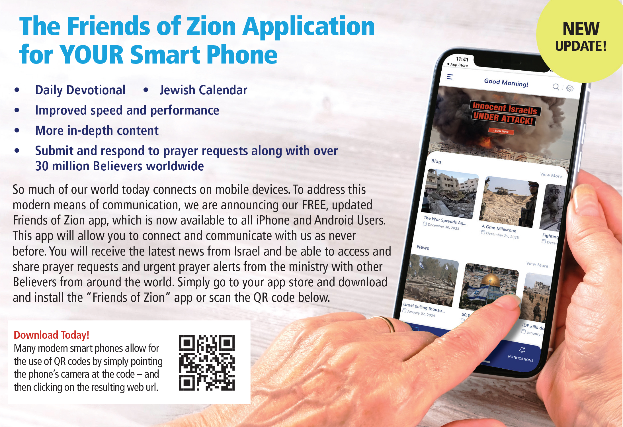 So much of our world today connects on mobile devices. To address this modern means of communication, we are announcing our FREE, updated Friends of Zion app, which is now available to all iPhone and Android Users. This app will allow you to connect and communicate with us as never before. You will receive the latest news from Israel and be able to access and share prayer requests and urgent prayer alerts from the ministry with other Believers from around the world. Simply go to your app store and download and install the “Friends of Zion” app or choose from the below.